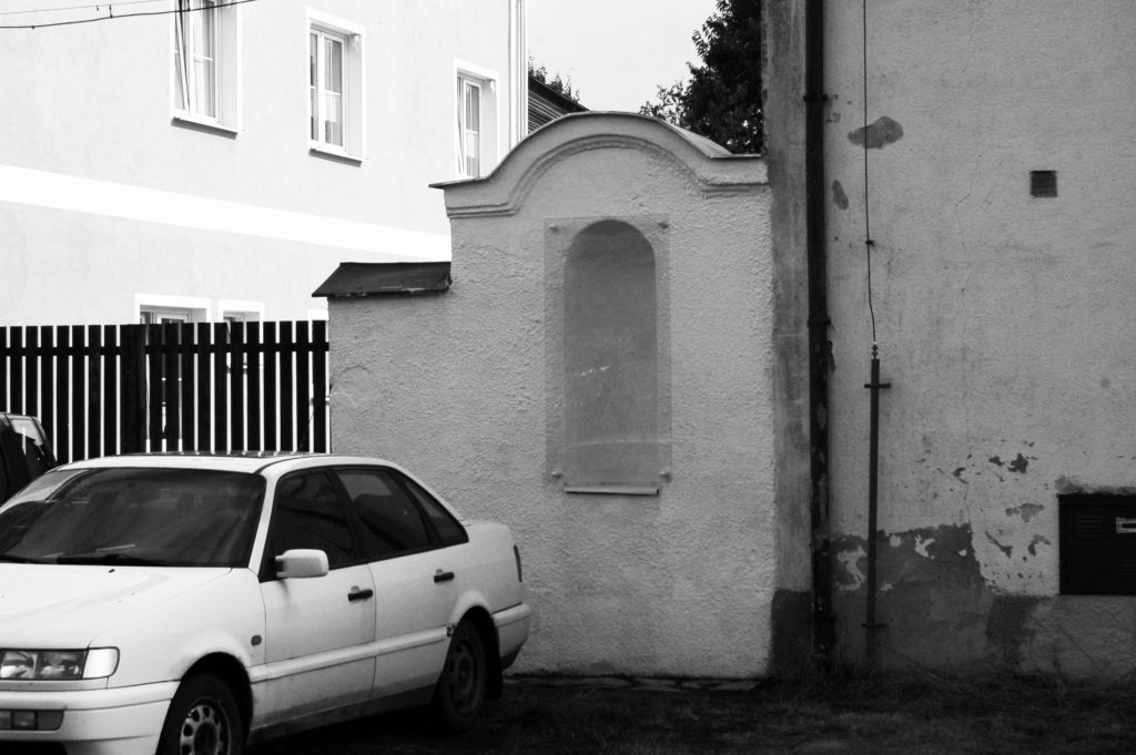 U hlavní cesty se nachází kaplička, v níž kdysi stávala socha sv. Floriana. Mým záměrem bylo ho nějakým způsobem zase vrátit do prostoru kapličky. Když jsem si studovala osobnost sv. Floriana, utkvěly mi především dvě věci. První byla, že byl kvůli své víře utopen a druhá, že se po nějaké době stal patronem hasičů.