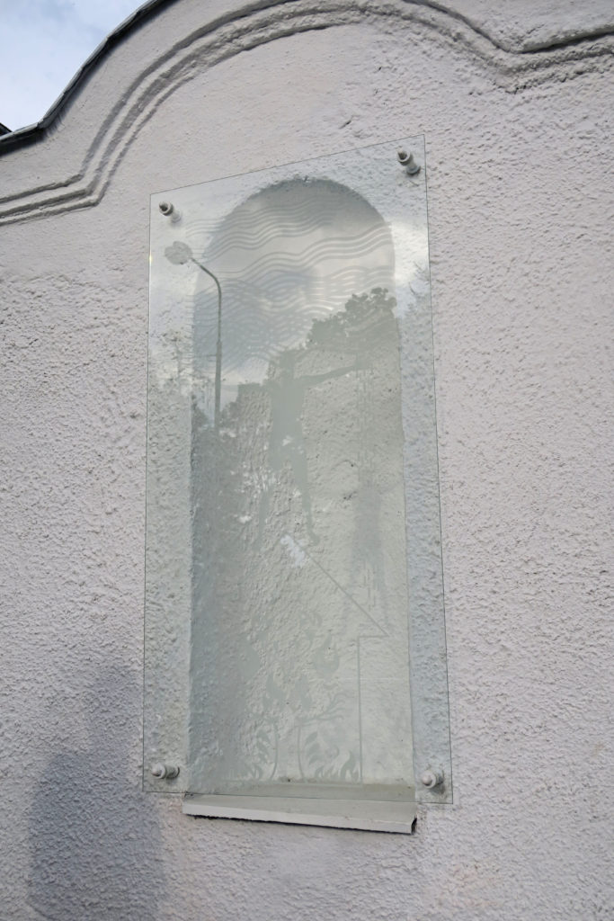 Jedná se o leptané sklo, které schematicky zobrazuje, jak se Florian noří ven z vln, ve kterých zemřel a stahuje z nich déšť na hořící dům pod sebou. Plamínky evokují tradiční lidové rostlinné motivy, jako odkaz na lidovou oblíbenost tohoto svatého. Vniklé dílo na sebe nepoutá příliš mnoho pozornosti. Když je zamračeno, je kresba potlačená, ale když zasvítí ostré slunce, leptaná místa nepropustí světlo a tak uvnitř vzniká stínohra a „duch sv. Floriana“ se zjevuje v prostoru výklenku.