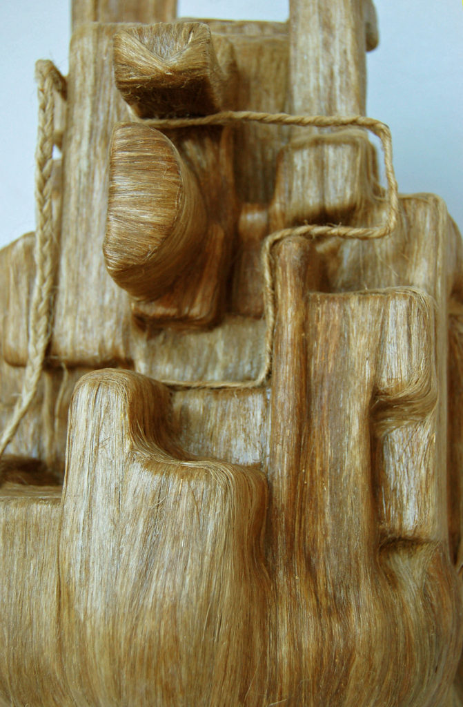 Socha je inspirovaná zábavnými karikaturami z doby baroka a rokoka, na kterých jsou kresby žen s absurdně vysokými a pompézními účesy. Dalo by se dokonce říct, že byly malými architekturami, protože v sobě měly zabudované vnitřní konstrukce, na které se pak naplétaly i další umělé vlasy. Vytvořila jsem objekt, ve kterém propojuji historický typ účesu s architektonickým modelem hypermoderního města, ve kterém jsou na sebe domy namačkány a mrakodrapy se ženou do výšky.